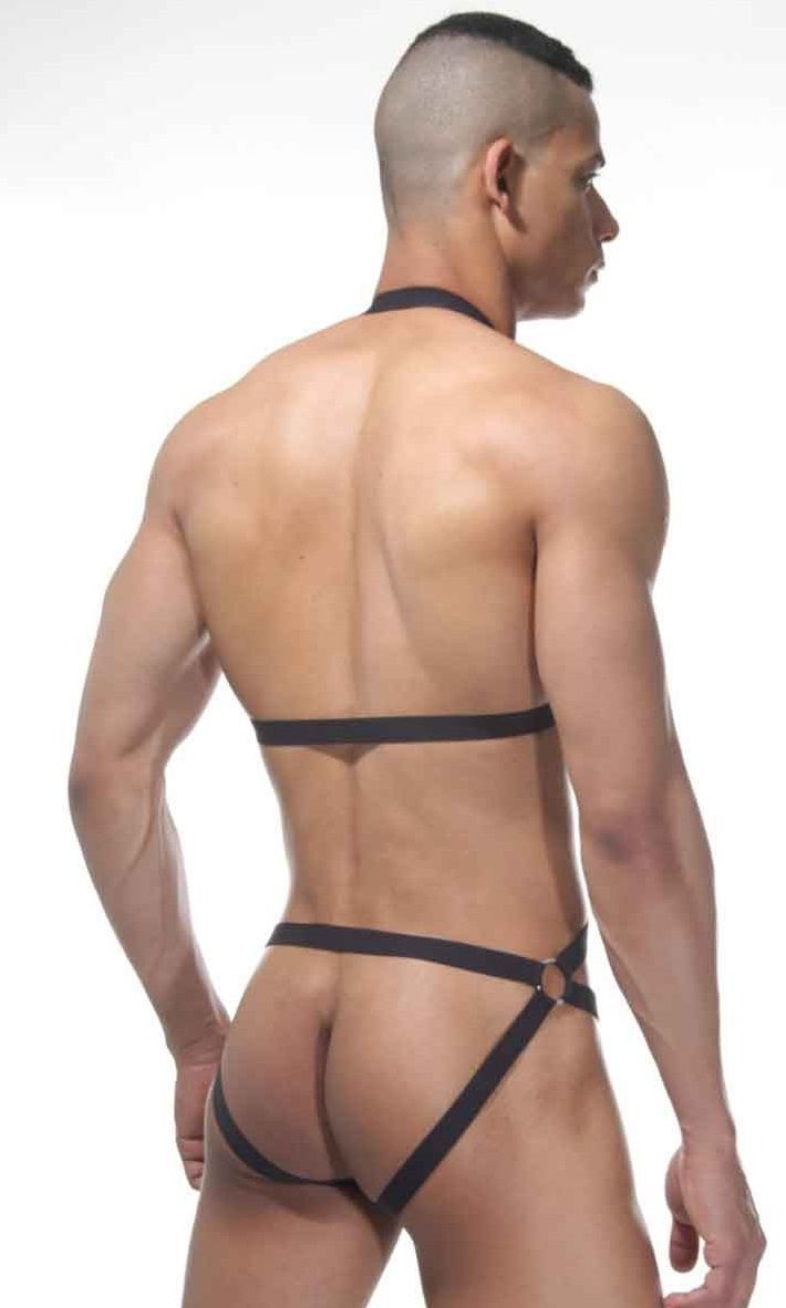 Мужское боди, сделанное из разной длины ремешков, соединенных между собой металлическими кольцами. Ягодицы в этом комплекте полностью открыты.