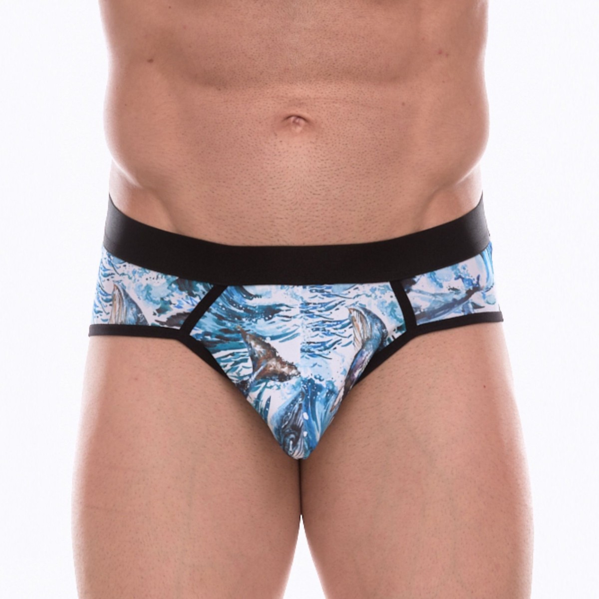 Мужские трусы-стринги с принтом в виде китов в волнах.