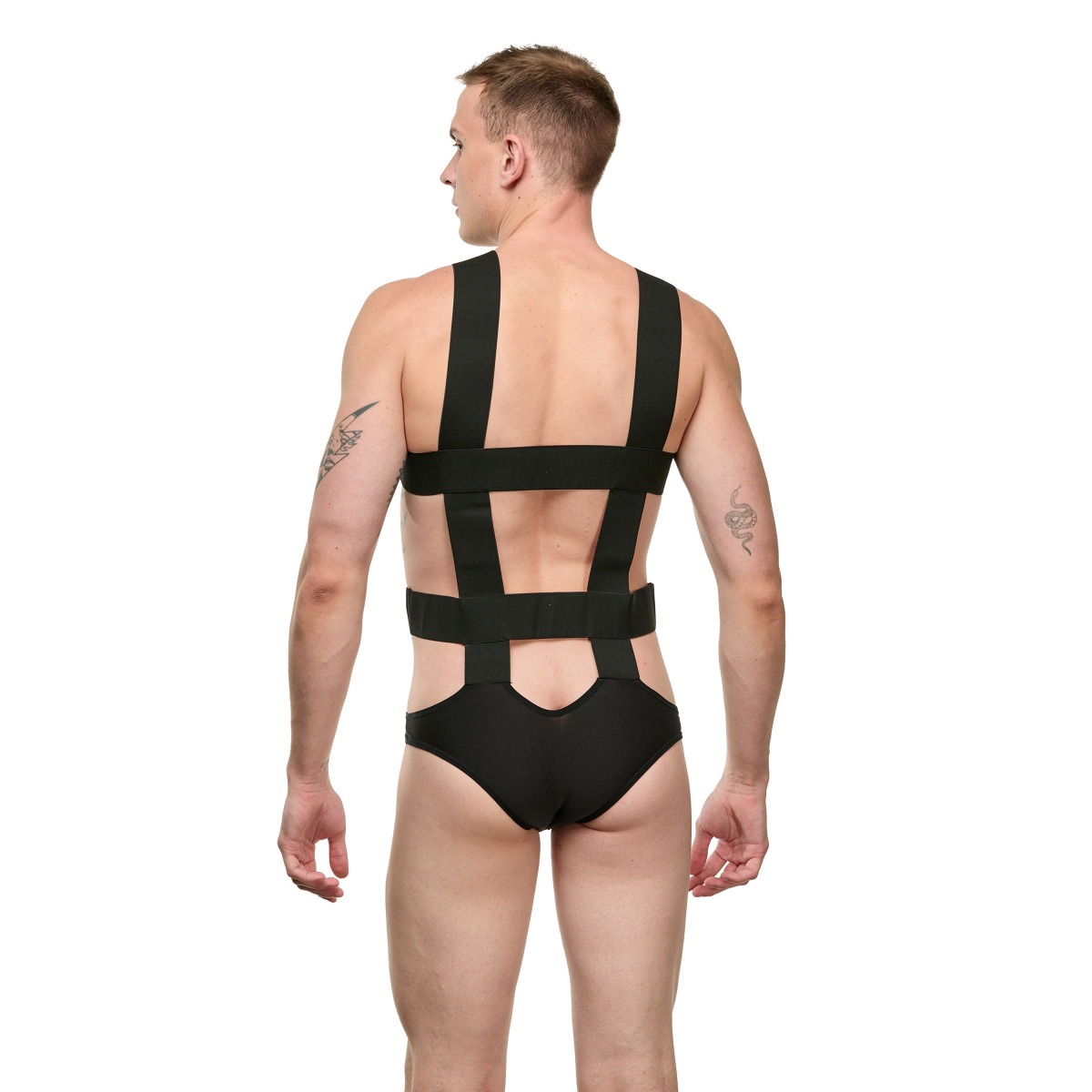 Мужское черное боди с широкими эластичными ремешками.