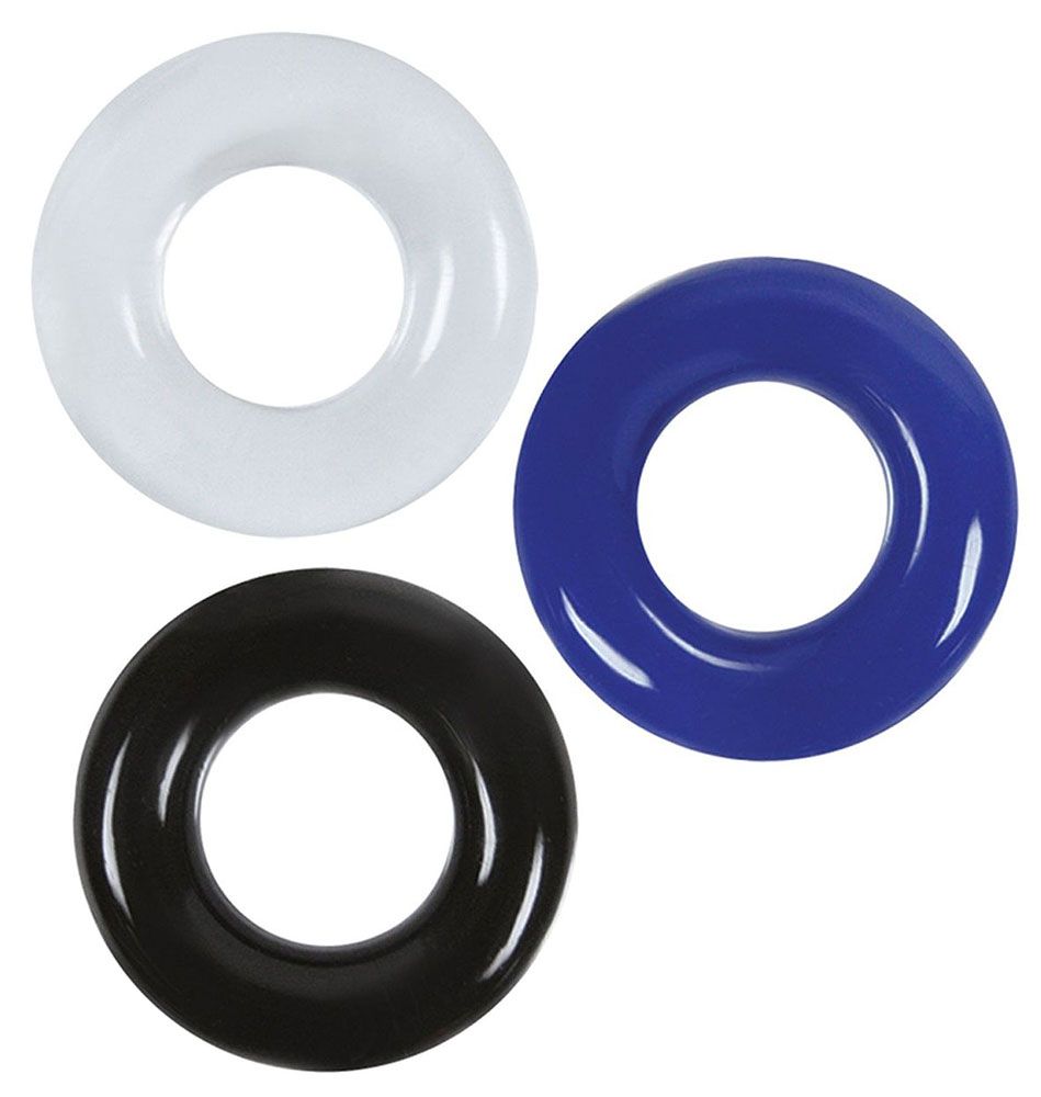 Эрекционные кольца изготовлены из очень эластичного силикона. Они подходят для любого пениса. Набор из 3 эрекционных колец прозрачного, голубого, черного цветов. Внутренний диаметр - 1,75 см.