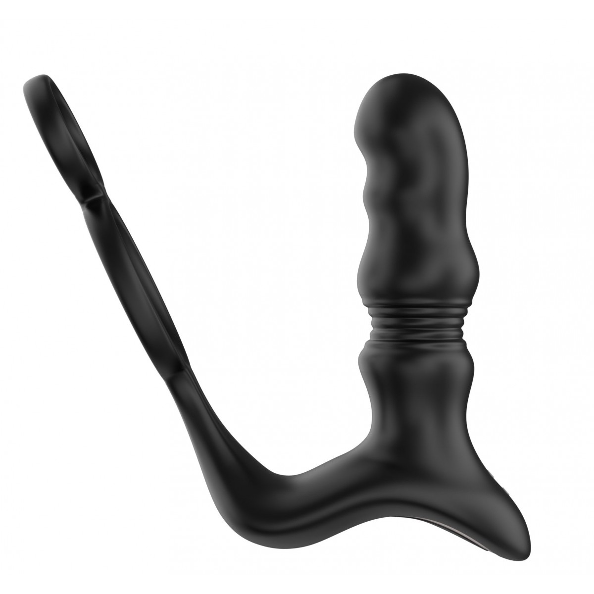 Черный вибростимулятор простаты с поступательными движениями и пультом ДУ. Оснащена 9 скоростями. Своим строением эта игрушка может одновременно стимулировать несколько зон. Пульт ДУ помогает упросить процесс переключения режимов у игрушки. Рабочая длина - 9 см.