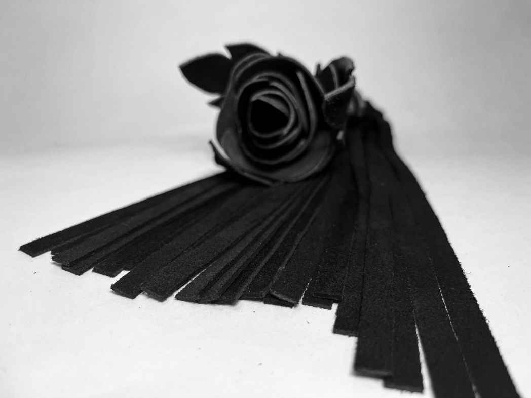 Восхитительная мини-плеть, украшенная чёрной розой. Цветок полностью выполнен из натуральной лаковой кожи, листочки розы и рукоятка выполнены из мягкой натуральной кожи, а хвосты плети - натуральная мягкая замша. Размеры этой плети очень изящны, поэтому данную плеть можно использовать, как генитальную, чтобы добавить новых ярких ощущений. Розочка очень удобно лежит в руке и создает неповторимую атмосферу и настроение, этот аксессуар никого не оставит равнодушным!