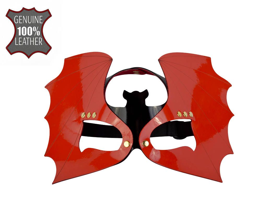 Маска изготовлена из натуральной лаковой кожи красного и черного цвета. Резинка с пряжкой позволяет регулировать изделие по размеру.