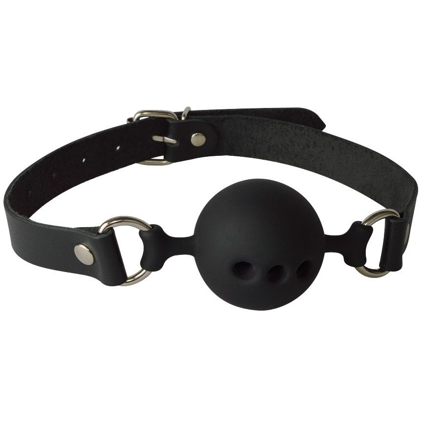 Силиконовый кляп-шар с отверстиями для дыхания. Ремешок регулируется при помощи пряжки.