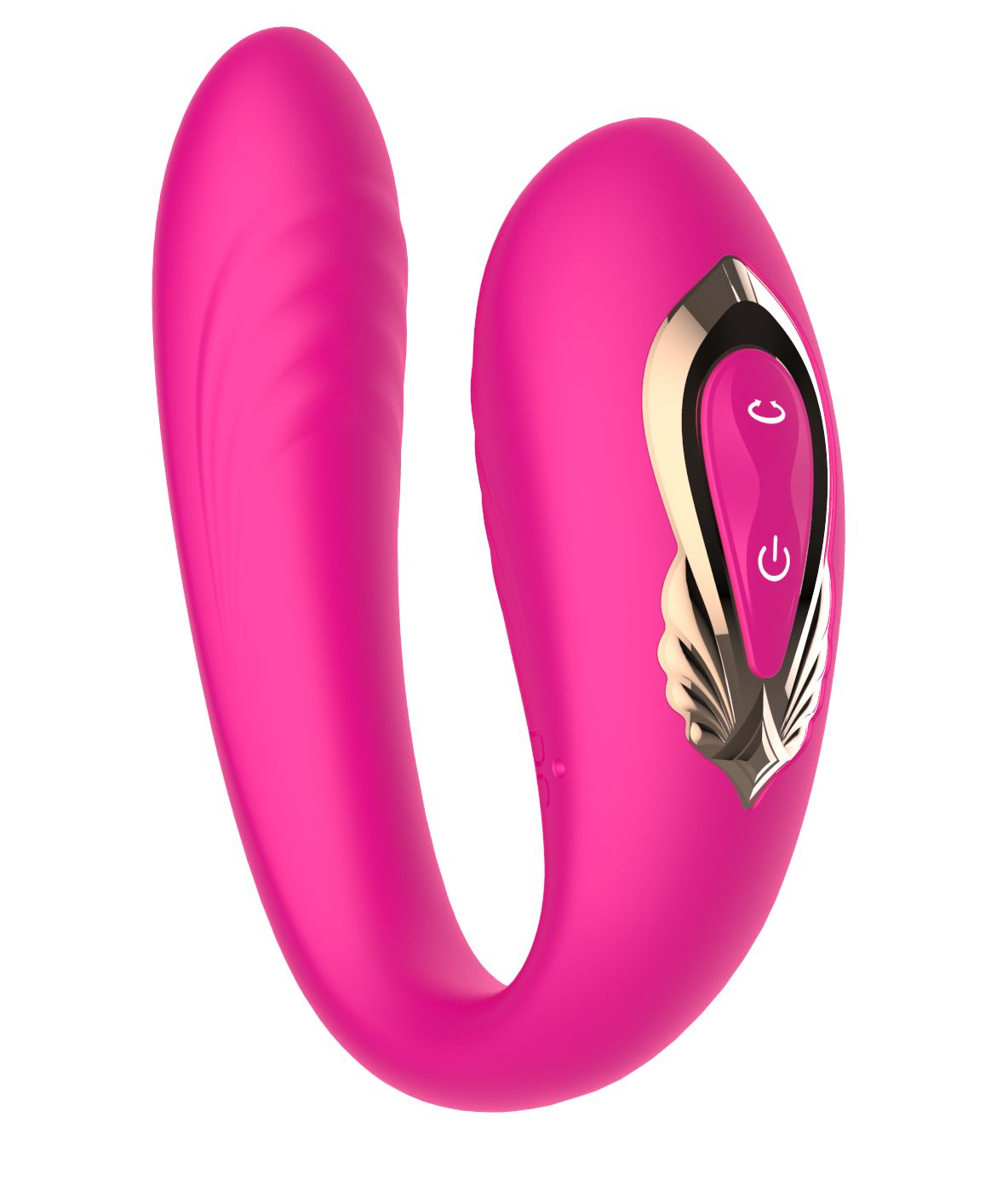 Розовый U-образный вибратор с вращающейся вагинальной частью. Воздействует одновременно на точку G и клитор. Режимы переключаются при помощи пульта ДУ.